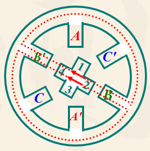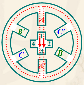 ![]() A 相通電使轉(zhuǎn)子1、3齒和 AA' 對齊。