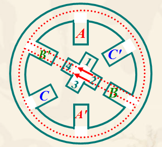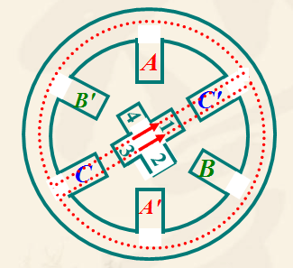 ![]() (1)BB' 磁場對 2、4 齒有磁拉力,該拉力使轉(zhuǎn)子順時針方向轉(zhuǎn)動。 (2)AA' 磁場繼續(xù)對1、3齒有拉力。 所以轉(zhuǎn)子轉(zhuǎn)到兩磁拉力平衡的位置上。相對AA' 通電,轉(zhuǎn)子轉(zhuǎn)了15°。 B相通電,轉(zhuǎn)子2、4齒和B相對齊,又轉(zhuǎn)了15°。