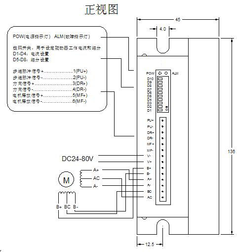 注:可根據(jù)客戶(hù)要求定制細(xì)分?jǐn)?shù)! !注意 1、輸入電壓不能超過(guò)DC80V; 2、輸入控制信號(hào)電平為5V,當(dāng)高于5V時(shí)需要接限流電阻; 3、輸入脈沖信號(hào)下降沿有效; 4、驅(qū)動(dòng)器溫度超過(guò)80度時(shí)驅(qū)動(dòng)器停止工作,故障指示燈ALM亮,直到驅(qū)動(dòng)器溫度降到50度時(shí),驅(qū)動(dòng)器需要重新上電才能恢復(fù)工作。出現(xiàn)過(guò)熱保護(hù)請(qǐng)加裝散熱器; 5、過(guò)流(負(fù)載短路)故障指示燈ALM亮,請(qǐng)檢查電機(jī)接線(xiàn)及其他短路故障,排除后需要重新上電恢復(fù); 6、無(wú)電機(jī)故障指示燈ALM亮,請(qǐng)檢查電機(jī)接線(xiàn),排除后需要重新上電恢復(fù)。 驅(qū)動(dòng)器接線(xiàn)、尺寸示意圖